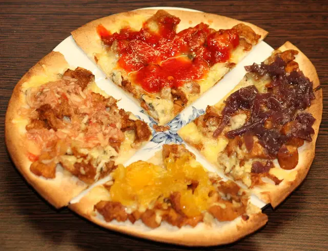 Täna hommikul oli kange tahtmine kasutada eelpoolkirjeldatuid sahvrimaiuseid. Kapis leidus tortilla põhjasid (loe nahad) ja usinate sahvriliste poolt sügavkülma ladustatud kukeseeni. Niisiis praadisin pannil hakitud küüslauku ja kukeseened, laotasin need seejärel nahkadele, katsin riivjuustuga kuhu sai lisatud ka hallitusjuustu.