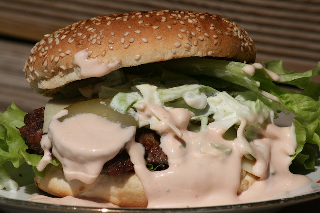 Burksi vahele sai valmistatud tõeliselt mõnus koorene kaste majoneesist, hapukoorest ja Teravast tšillikastmest, et ikka korralikult mööda põski alla voolaks ja tõelise Burgerkingi välimuse omandaks. Ka värske hapukurk ja salatileht olid omal kohal ning loomulikult juustuviil. Kindlasti tasub lisada ka Sibulamoosi, see sobib burksi vahele nagu valatult.